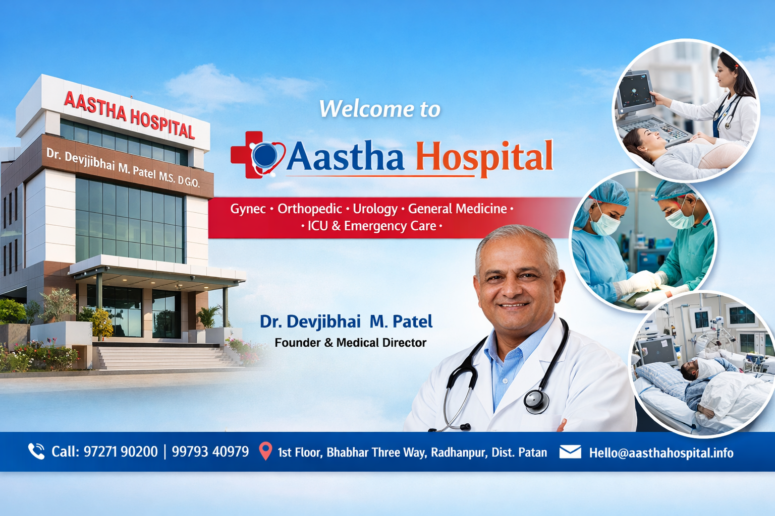 Aastha Hospital is a trusted multi-specialty hospital located at Radhanpur, District Patan, dedicated to providing compassionate, ethical, and high-quality healthcare services. Under the leadership of Dr. Devjibhai M. Patel, Aastha Hospital combines medical expertise with modern infrastructure to ensure the best possible patient outcomes.